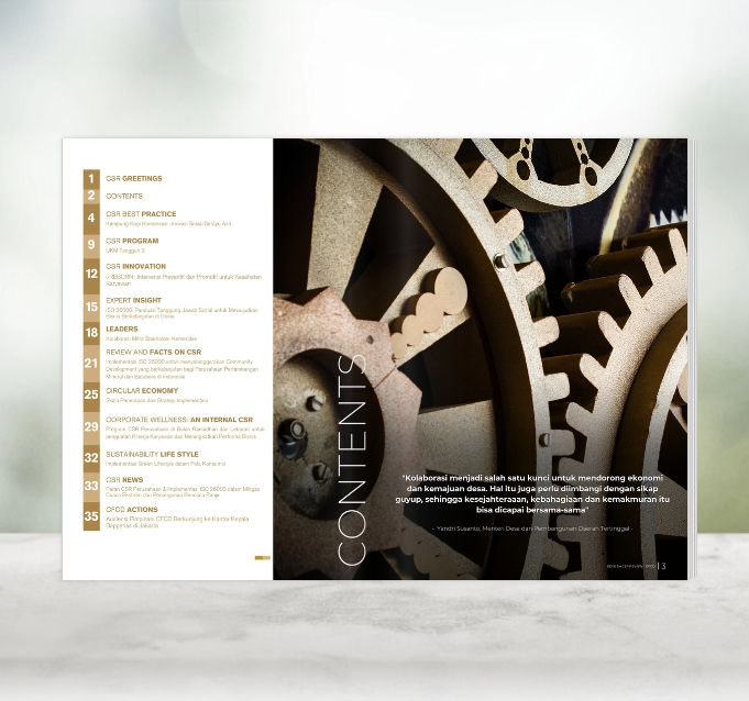 CSR Review adalah Majalah yang membahas dunia Social Responsibility (SR) meliputi Best Practice dan Inovasi dalam SR, ESG, Circular Economy, Corporate Wellness (Internal CSR), Green Healthy Living, dll yang tentunya akan membuka wawasan anda baik dalam implementasi SR khusunya maupun wawasan dalam kehidupan sosial secara umum.